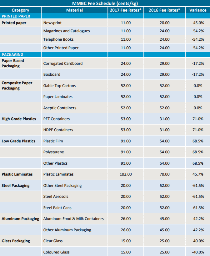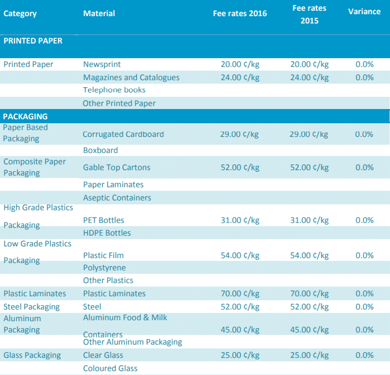 Each designated packaging and paper product material is associated with a fee rate. For each obligation year, fee rates are carefully calculated to using the Four-Step Fee Methodology to ensure fairness and to cover the costs associated with collection, transportation and processing of each material. An obligation year is a calendar year for which stewards are or were required to register, file a Producer Report and pay applicable fees. The first reporting year for this program was 2013 and the first payment (invoice) year was 2014.