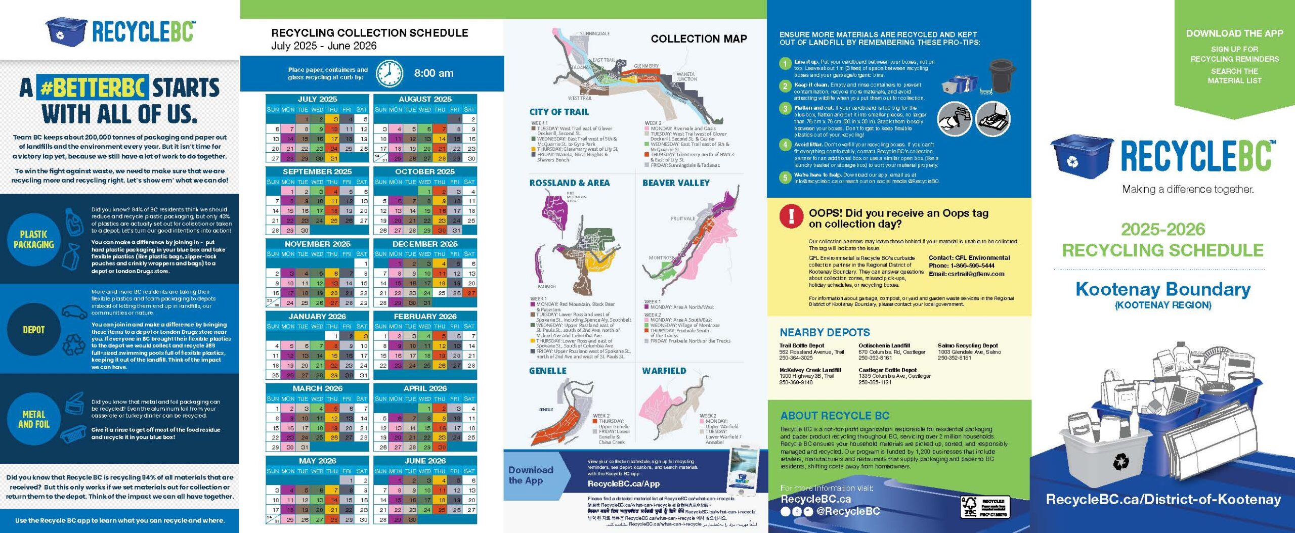 Download the 2025-2026 Regional District of Kootenay Boundary (Kootenay Region) Recycling Guide. The Recycling Guide outlines how to sort your recycling, shows what is not accepted, and includes a collection calendar.