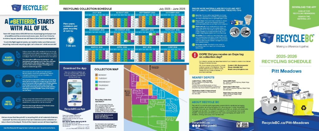 Download the 2025-2026 Pitt Meadows Recycling Guide. The Recycling Guide outlines how to sort your recycling, shows what is not accepted, and includes a collection calendar.
